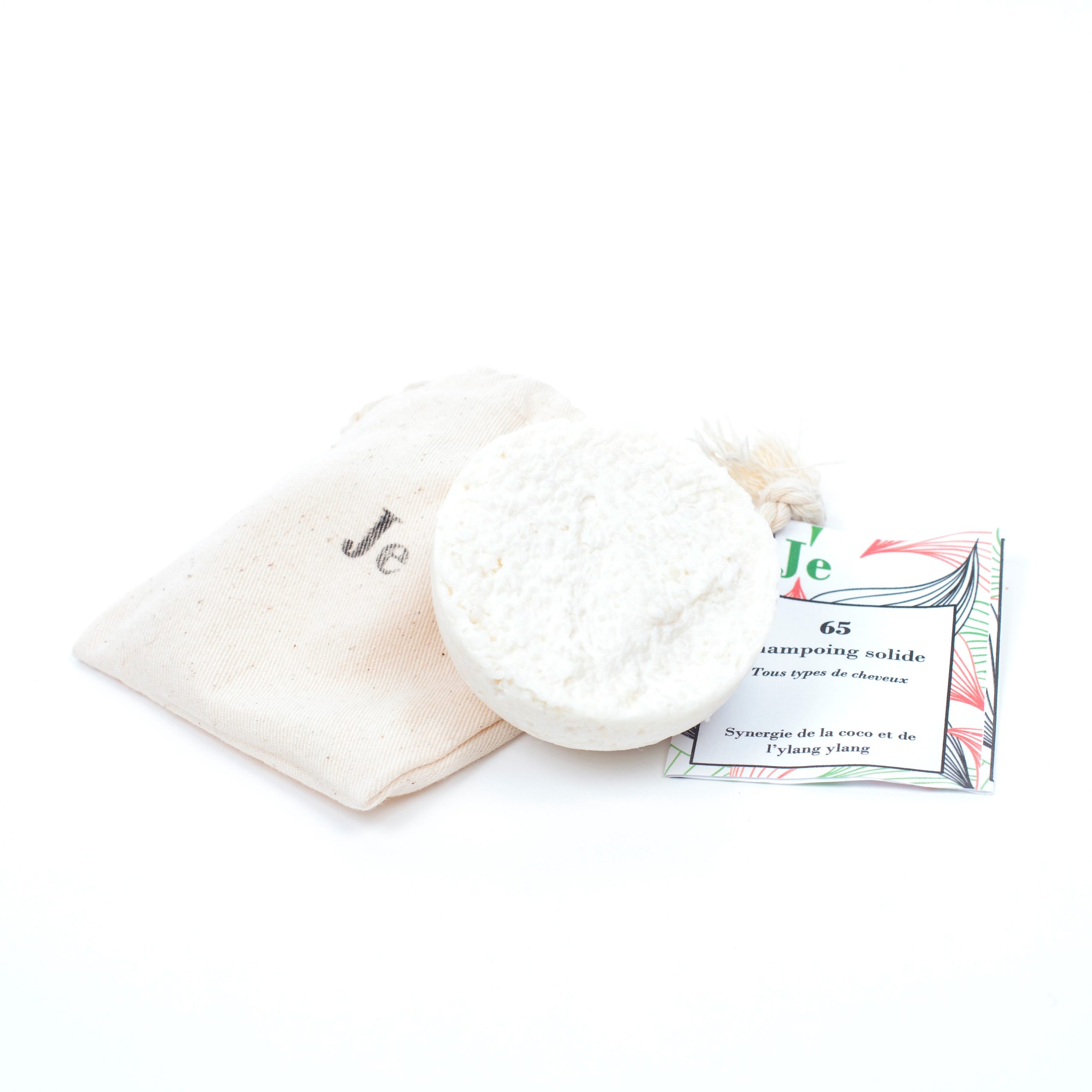 Le shampoing est vendu dans un pochon en coton réutilisable et une etiquette en papier.